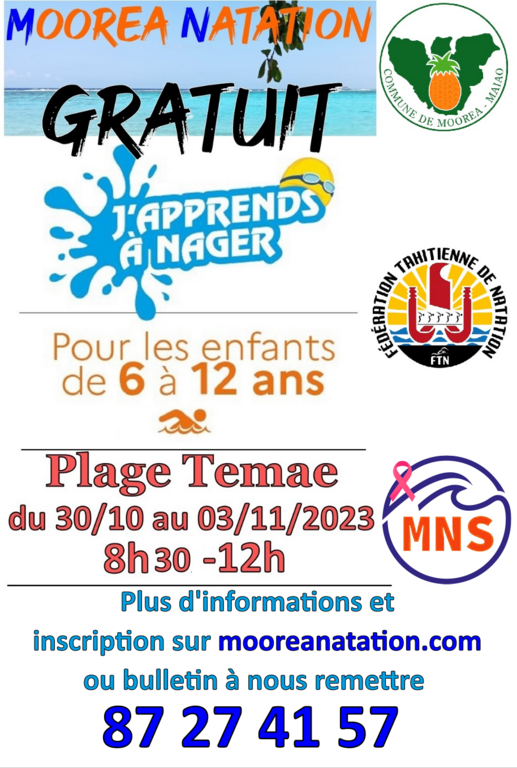 Tu es disponible pendant les vacances, tu peux venir à Temae et tu as entre 6 et 12 ans ? Stage gratuit de natation à la plage de Temae tous les matins du 30 octobre au 3 novembre 2023 Au programme, avoir une nage sécurisé, avoir confiance en soi et devenir meilleur dans l'eau, se dépenser et faire du sport pour sa santé, évoluer avec un groupe mixte pour encourager la solidarité, le partage et l'écoute de chacun.